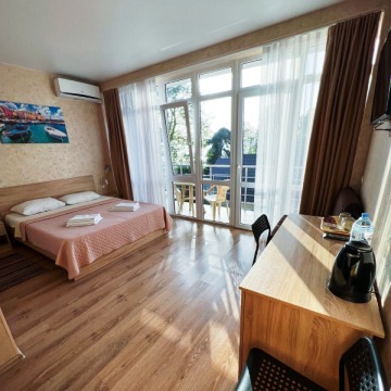 В номере: двуспальная кровать 160*200, шкаф, тумбочки прикроватные, стол, стулья, зеркало, сплит-система, телевизор, мини-холодильник, Wi-Fi, санузел, фен, сейф, балкон.