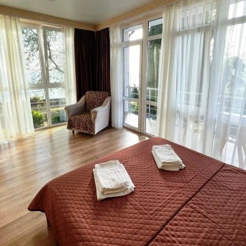 Море рядом. Двор всегда чистый. В номерах чисто, кондиционер, телевизор, небольшой холодильник,удобства в номере. Удобная кухня. На этаже были свои столики и стулья, можно было посидеть вечерком рядом с номером. Всё очень понравилось.